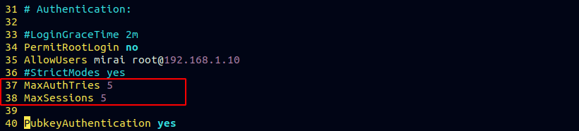 Giới hạn số lần đăng nhập sai giúp phần nào ngăn chặn các hình thức tấn công Bruteforce, Dictionary. Ngoài ra, cũng cần giới hạn số lượng phiên SSH cần thiết cùng lúc trên Server và thiết lập thời gian tự động thoát phiên (Session Timeout) nếu cần thiết.