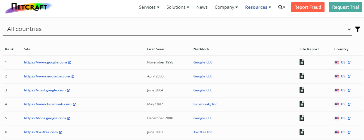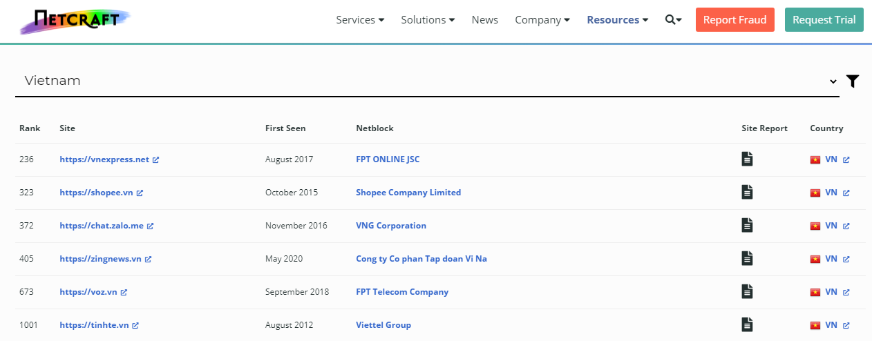 Trends Netcraft giúp thống kê các trang Web nào có nhiều lượt truy cập nhất, có thể lọc theo quốc gia.