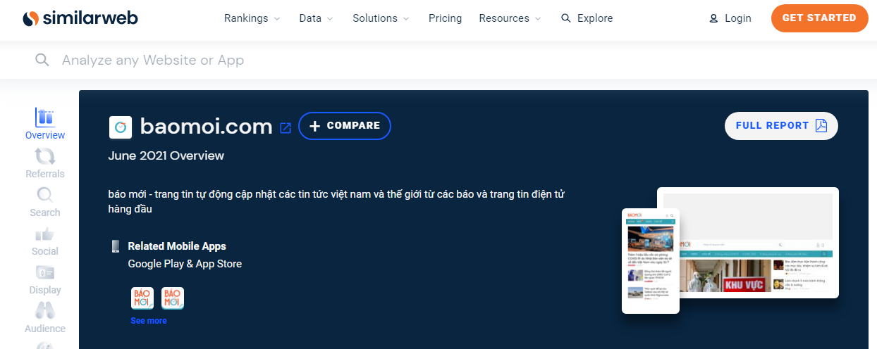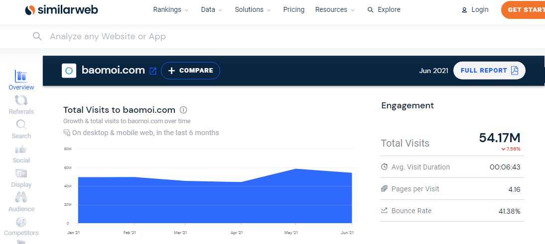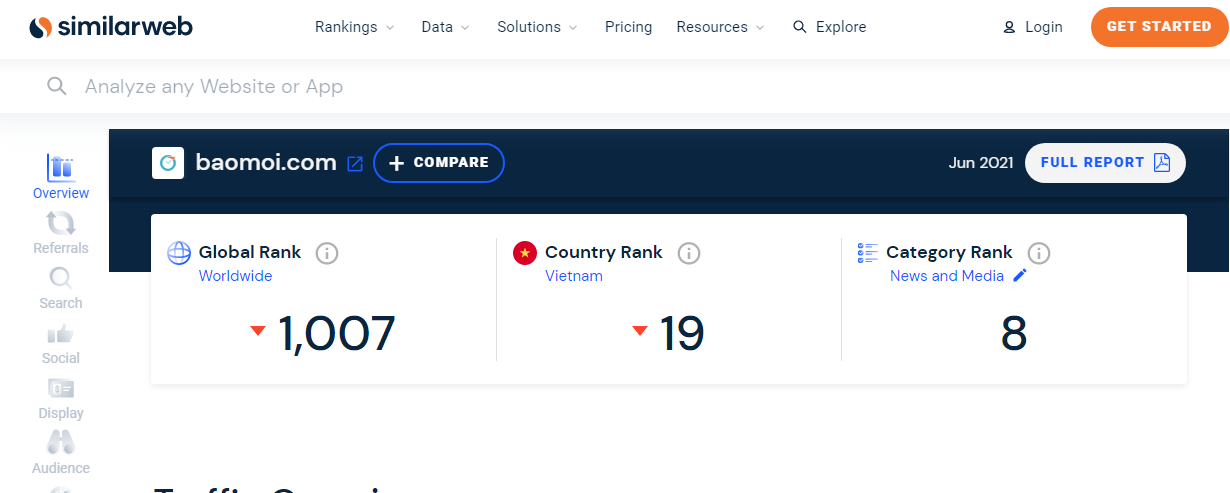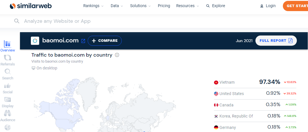 Similarweb giúp thống kê Traffic và lượt View chi tiết của một trang Web nhập vào.