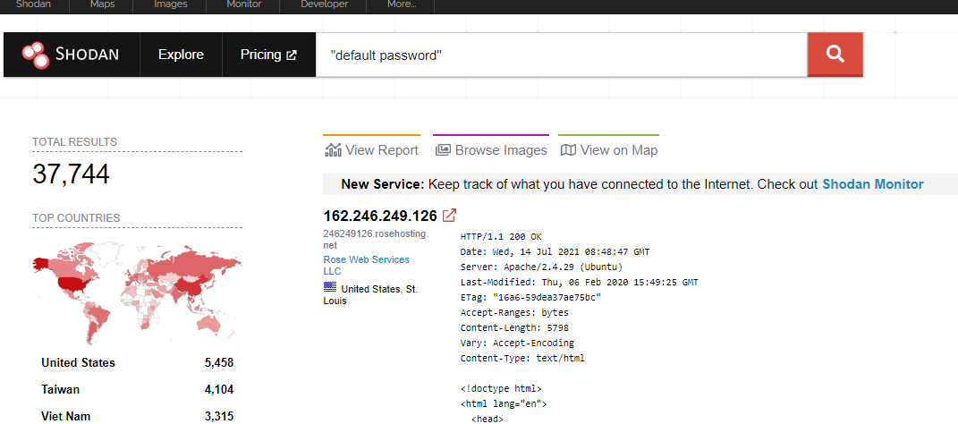 Shodan cũng có thể giúp tìm kiếm các thông tin về Default Password nhưng là thông tin Default Password của các thiết bị Online đang hoạt động trên toàn cầu bị rò rĩ như Router, Camera, …