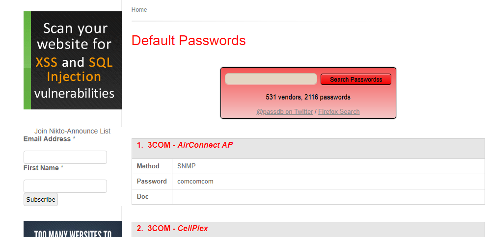 Cirt cung cấp thông tin các Default Password của nhiều dòng thiết bị phần cứng thuộc nhiều hãng sản xuất khác nhau