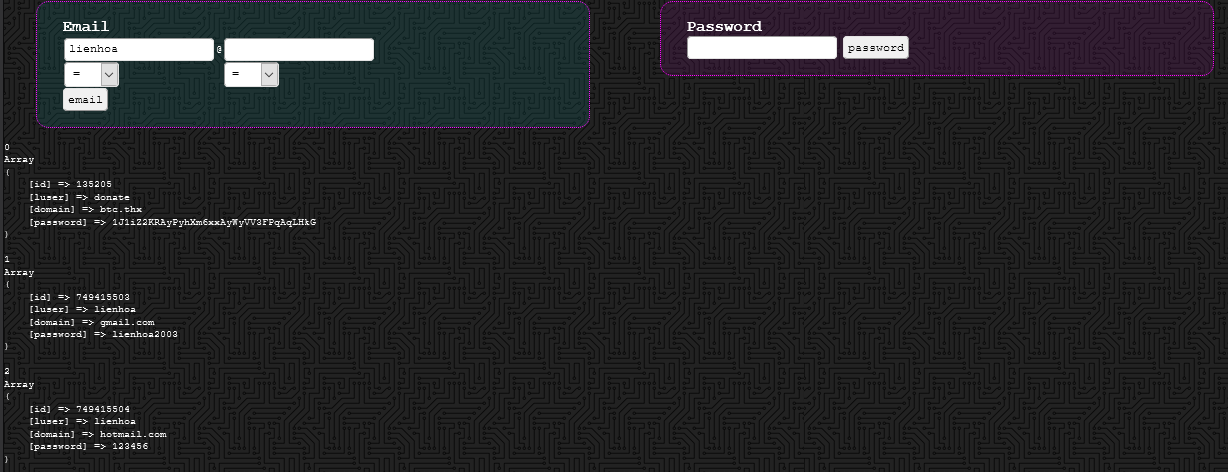 Nhập thông tin vào khung Email để biết có bất kỳ tài khoản nào có User là Email cá nhân đã nhập đã bị lộ mật khẩu hay không.