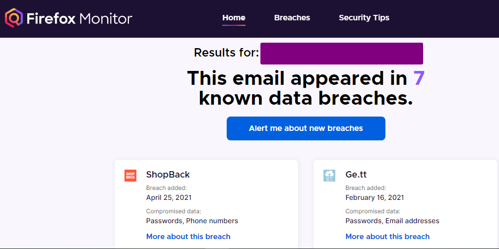 Firefox Monitor cũng giúp hỗ trợ kiểm tra Data Breaches đối với các tài khoản Email và cung cấp tính năng Alert nếu có phát hiện Data Breaches mới đối với tài khoản Email đăng ký.