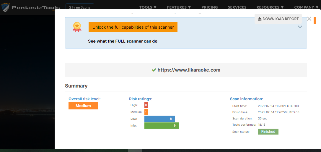 Website Scanner trong bộ pentest-tools giúp dò quét các lỗ hổng bảo mật tồn tại trong một Website và xuất Report chi tiết.